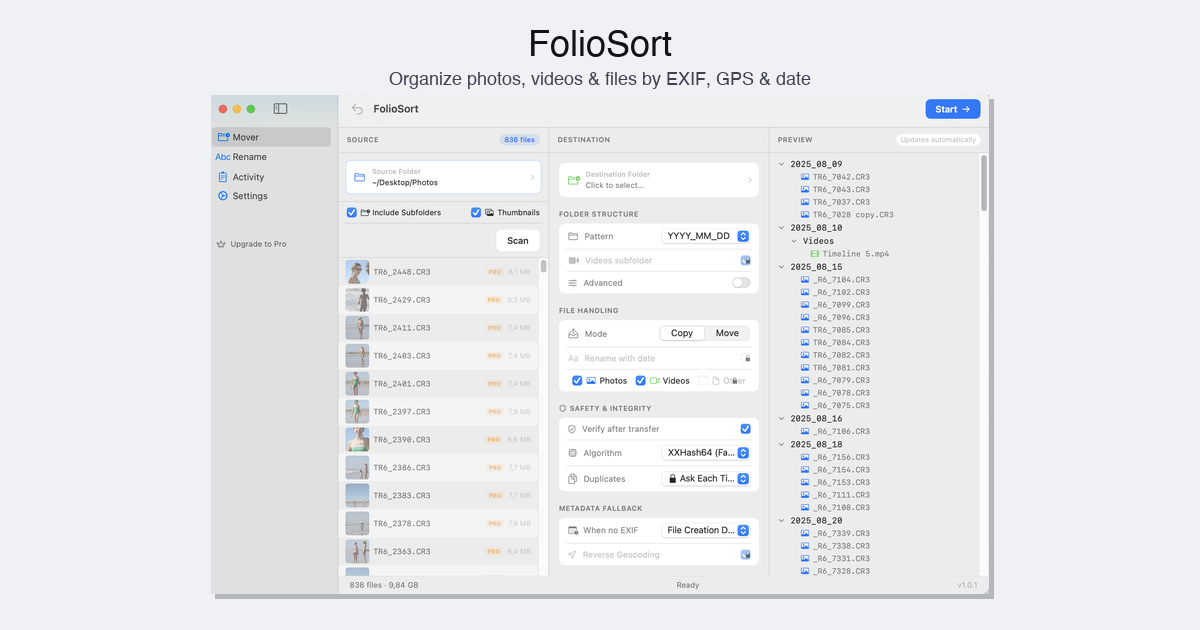 Automatically move photos and videos into date-based folders using EXIF metadata — not the file's creation date.